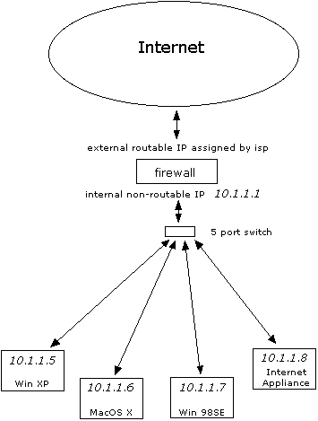 If you look at the diagram above, you will notice that each of the computers behind the firewall has a different IP address, and each of those addresses is in the range of non-routable addresses. If you are using the Mac, the only IP address it has is 10.1.1.6. Any internet traffic bound for the Mac that's directly addressed to 10.1.1.6 will never make it past the first router on the internet. All inbound packets must pass through the firewall, where NAT can rewrite the headers appropriately. Believe me, It Works! Congratulations to those of you that slogged through the technical stuff--I hope the effort was worth it! Some Frequently Asked Questions